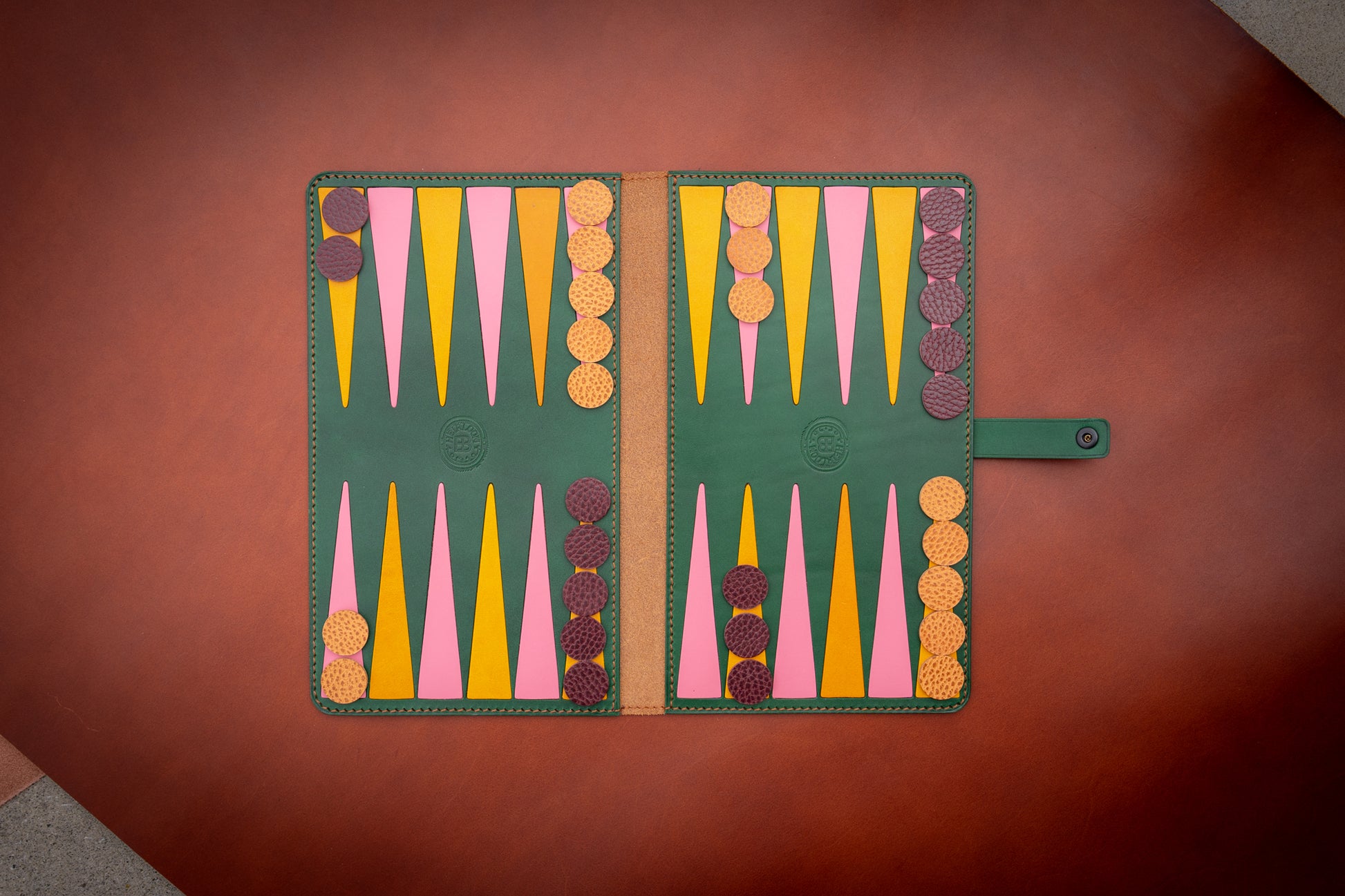 This portable backgammon journal is made with Italian Conceria Walpier Buttero leather, and Vinymo thread.