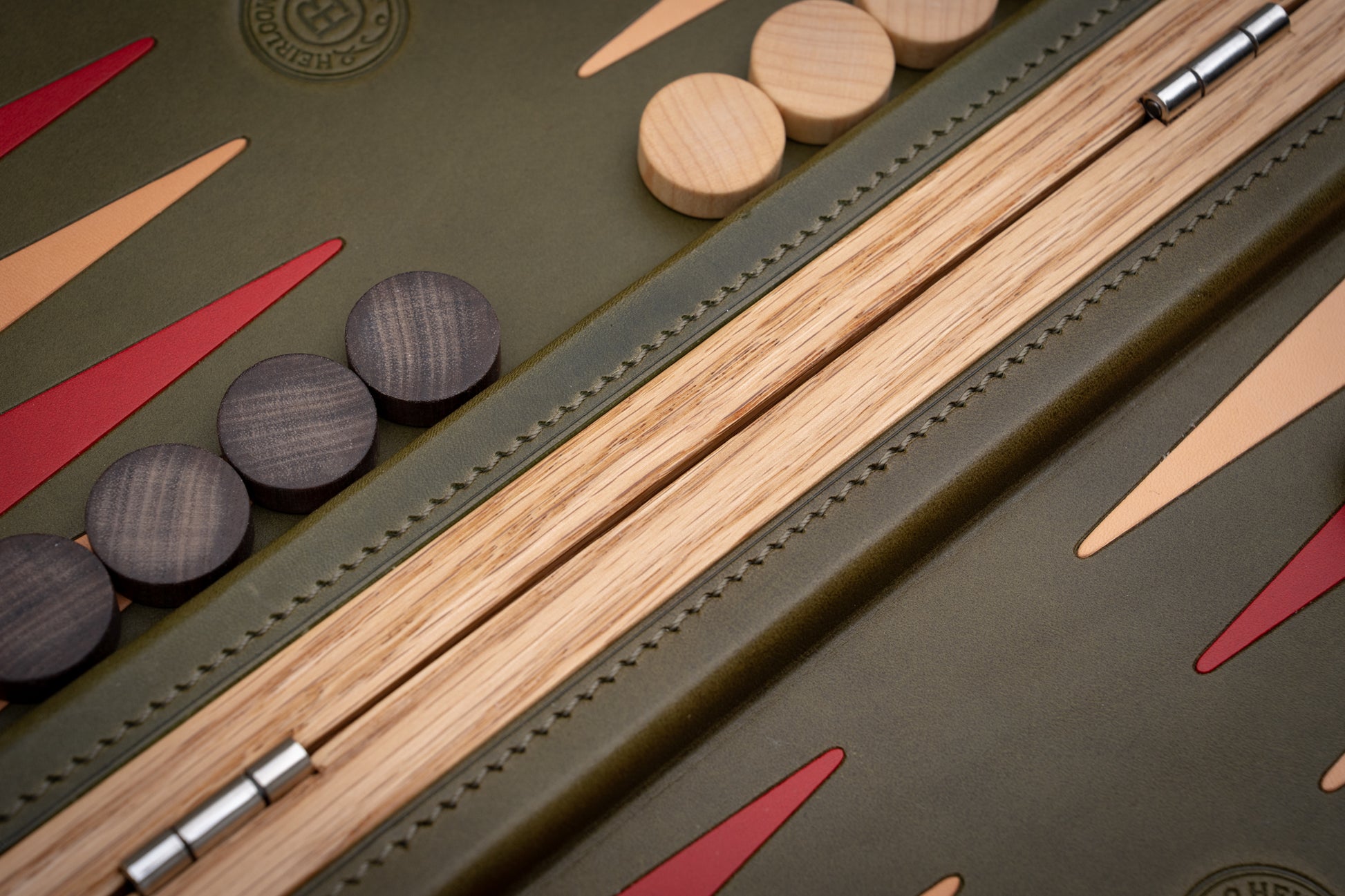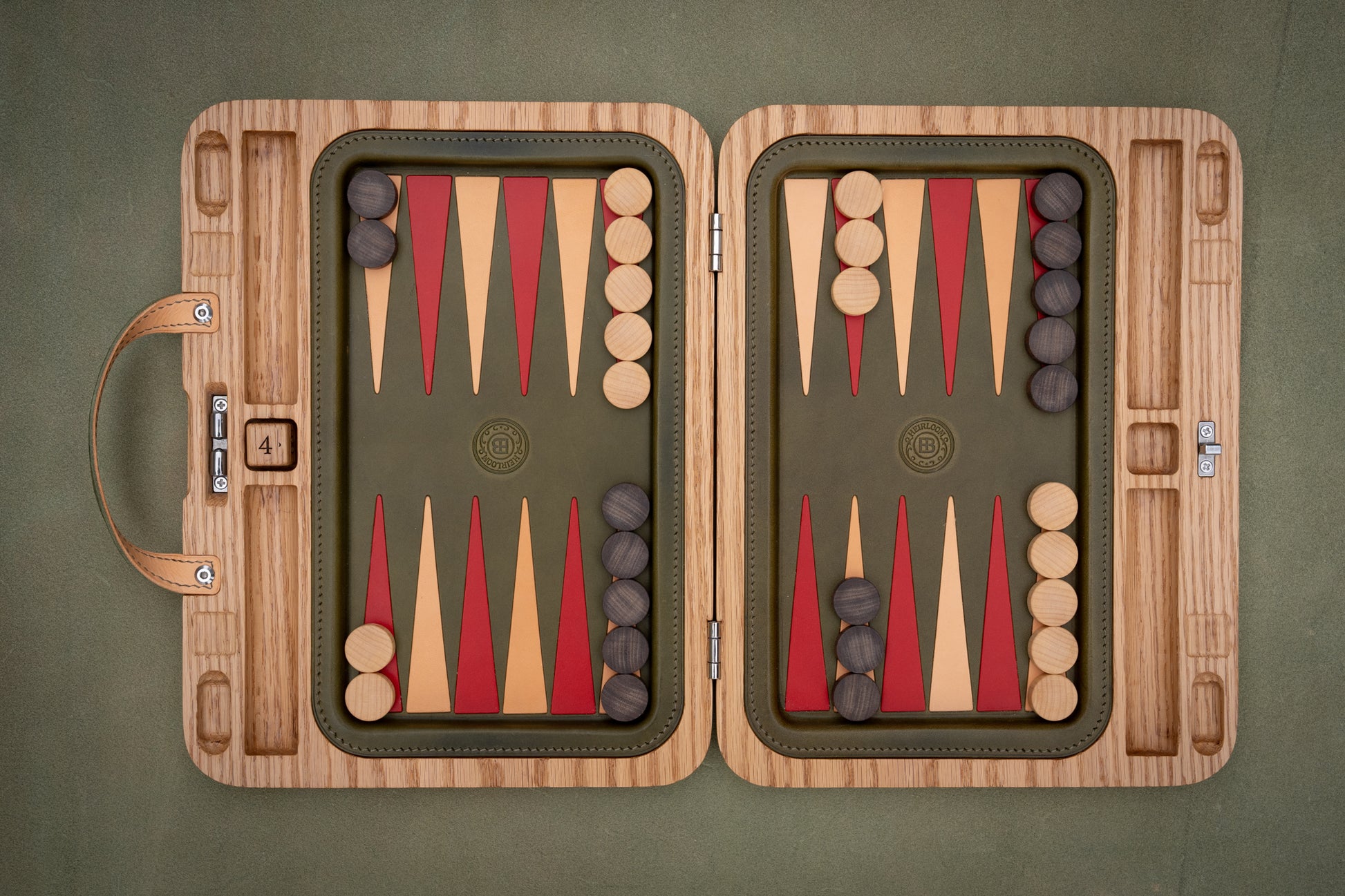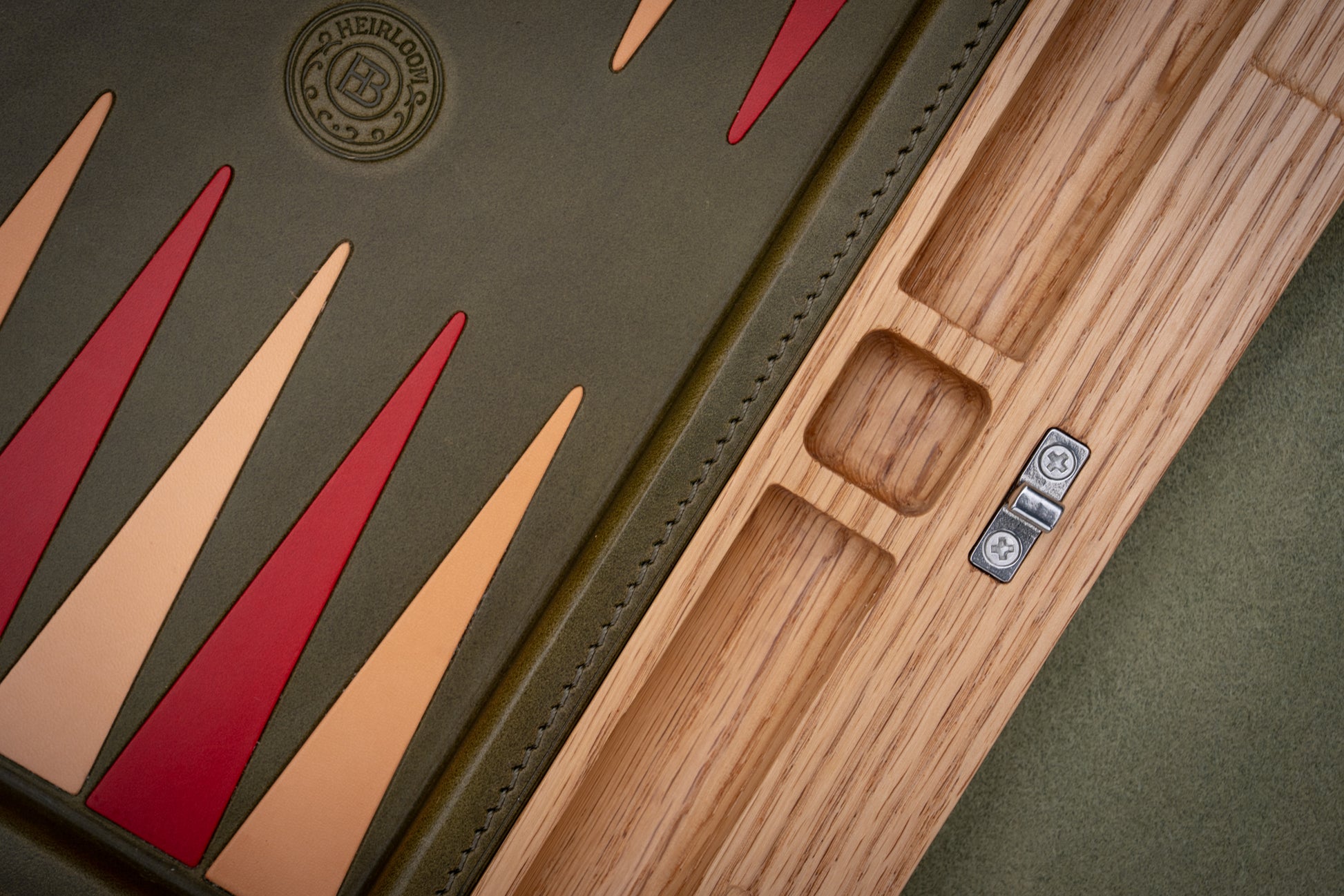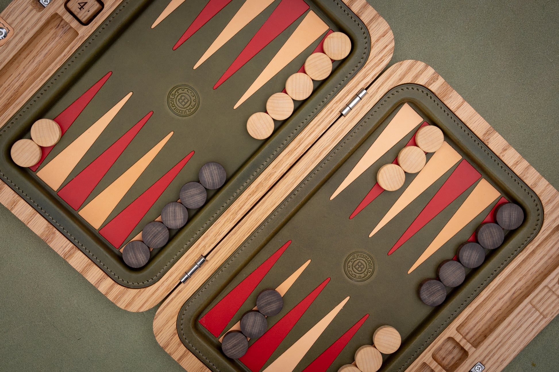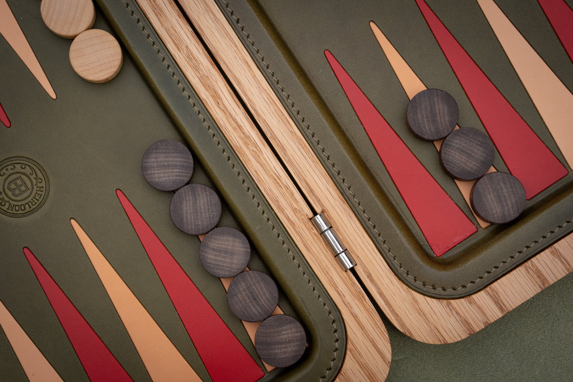 This portable backgammon board is made with Red Oak, Italian Conceria Walpier Buttero leather, stainless steel hardware and Vinymo thread.