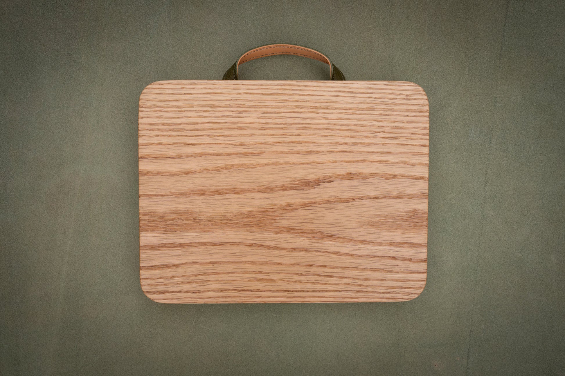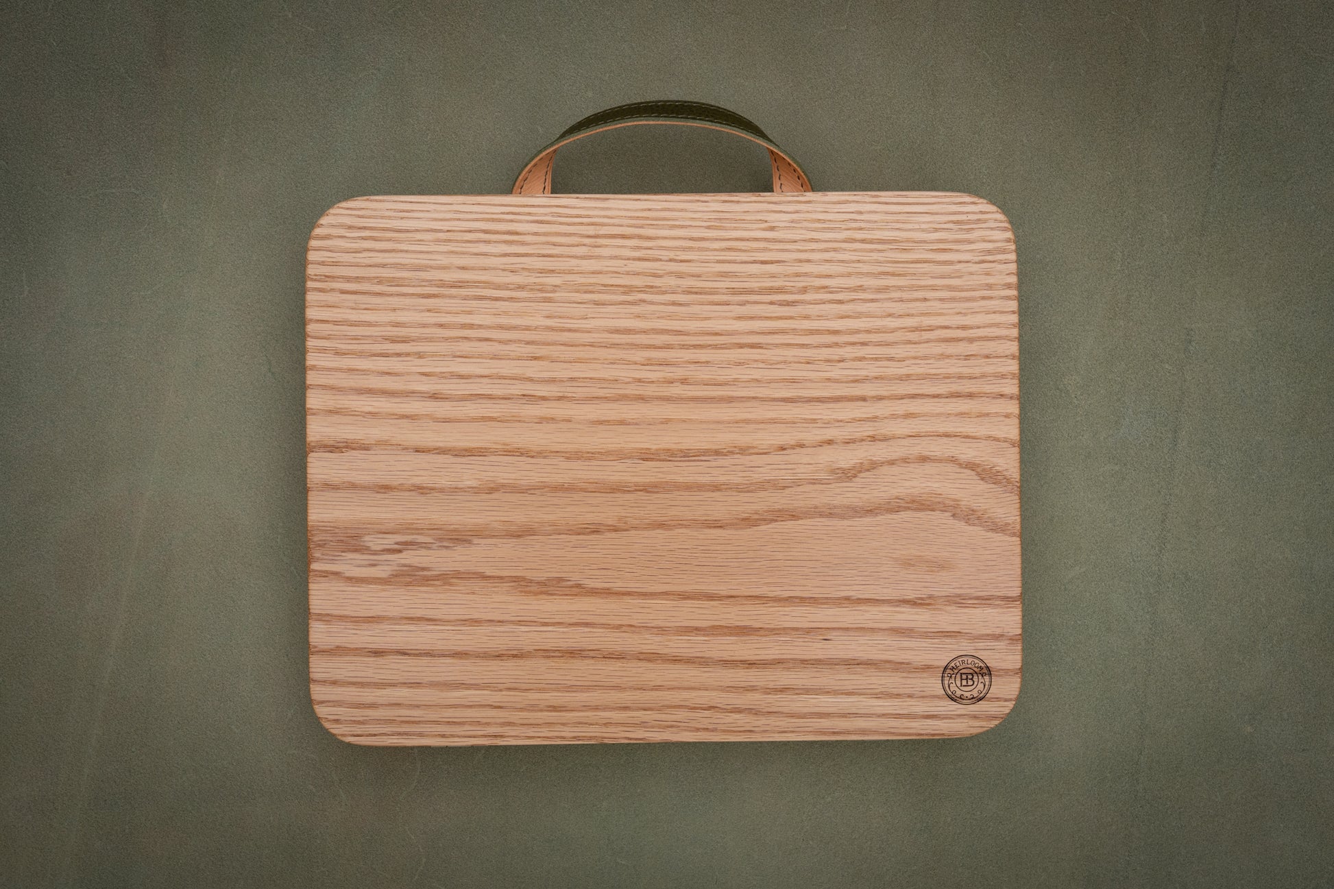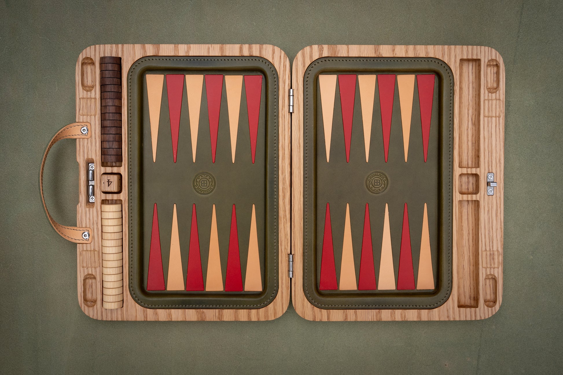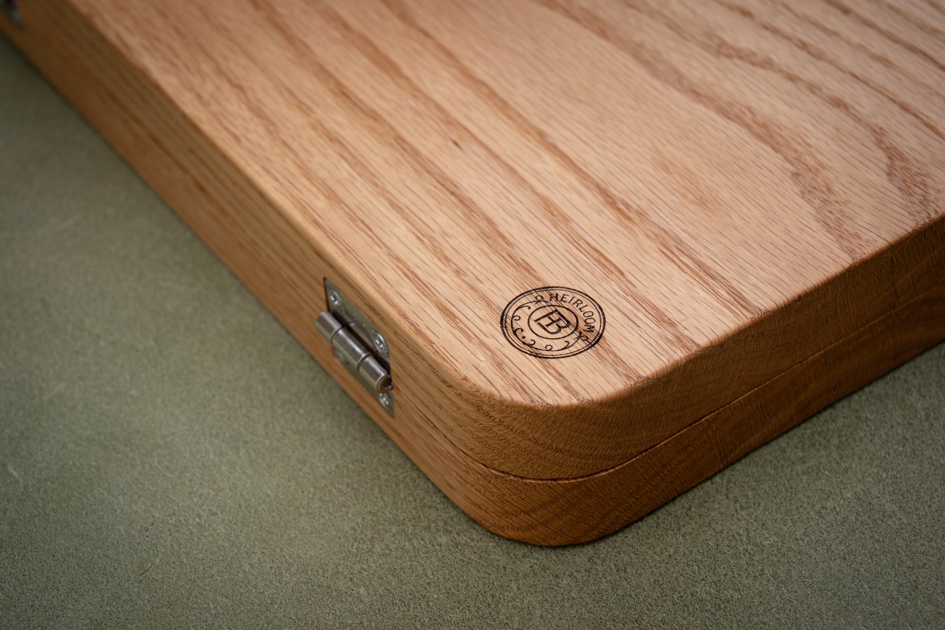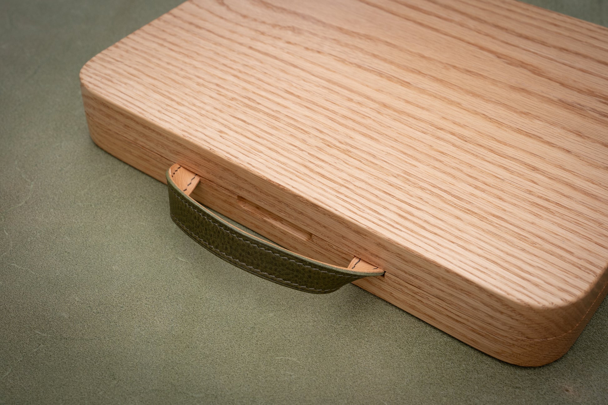 This portable backgammon board is made with Red Oak, Italian Conceria Walpier Buttero leather, stainless steel hardware and Vinymo thread.