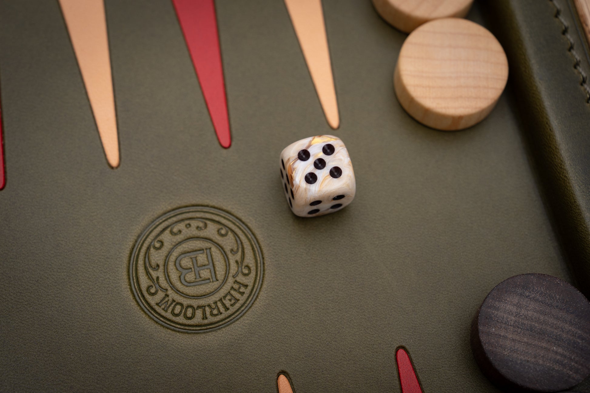 This board comes with 30 handmade checkers (15) Black Walnut (15) Birch, (4) dice and (1) doubling cube. The Heirloom Boards insignia laser etched into your hardwood case and embossed into leather.