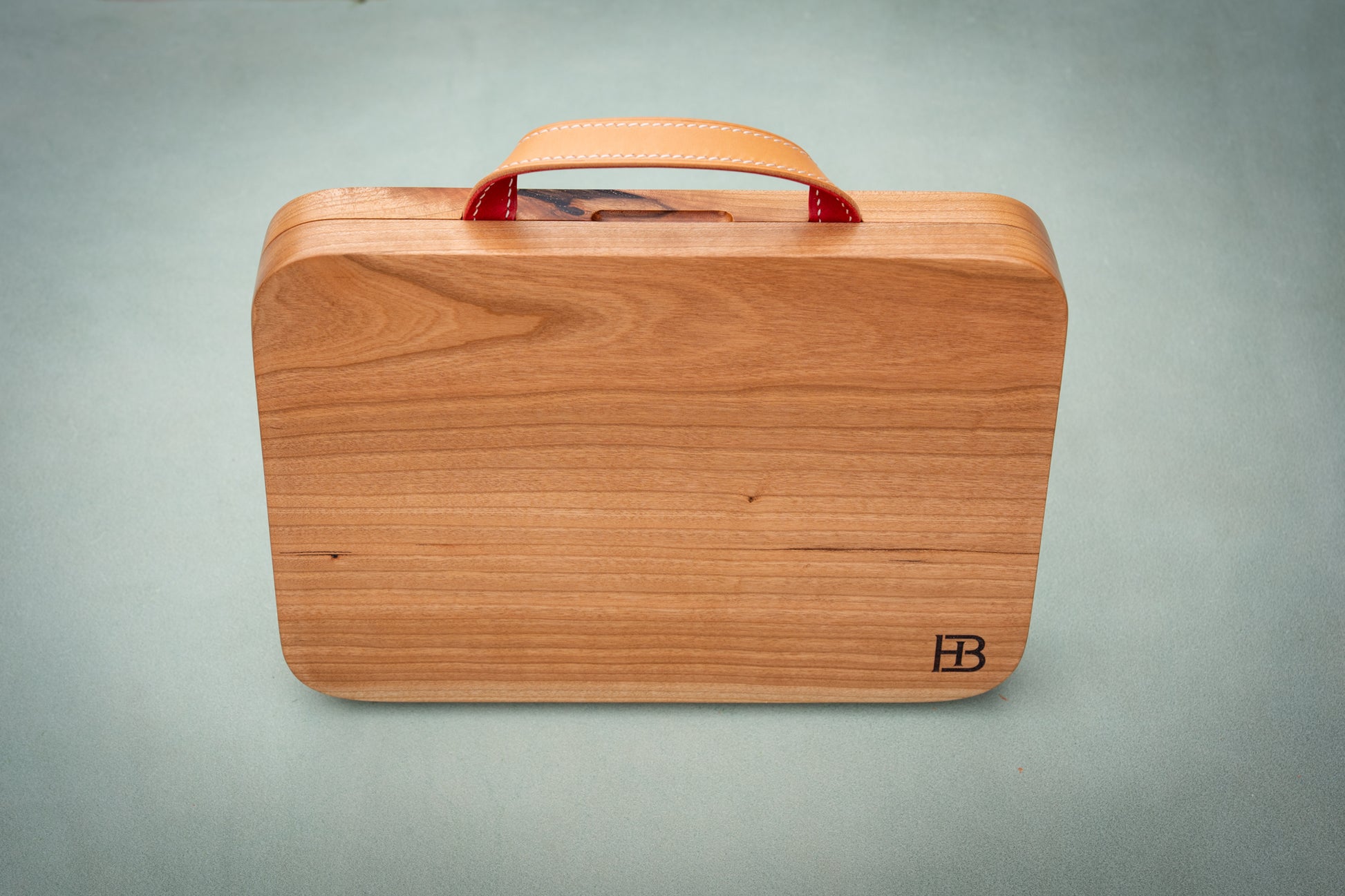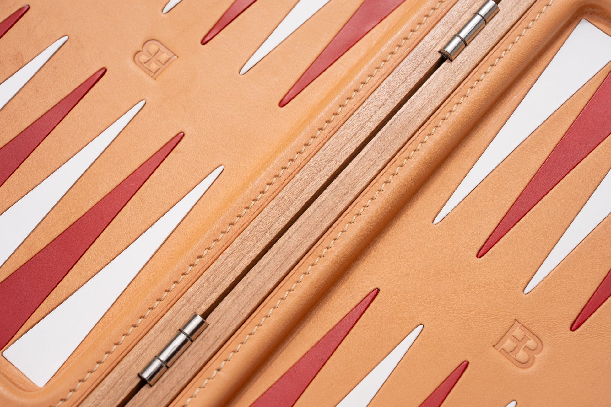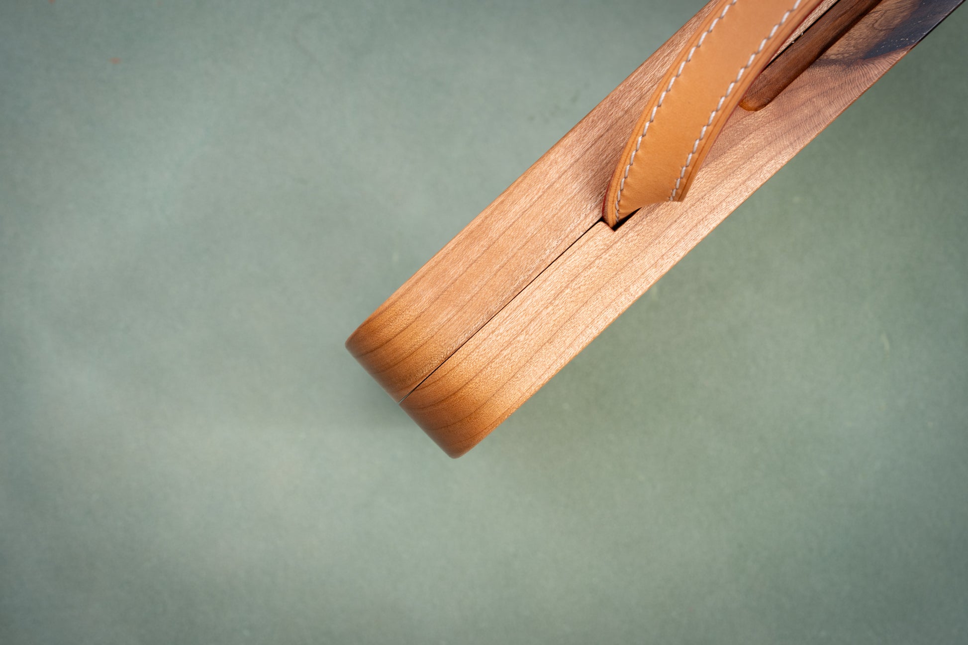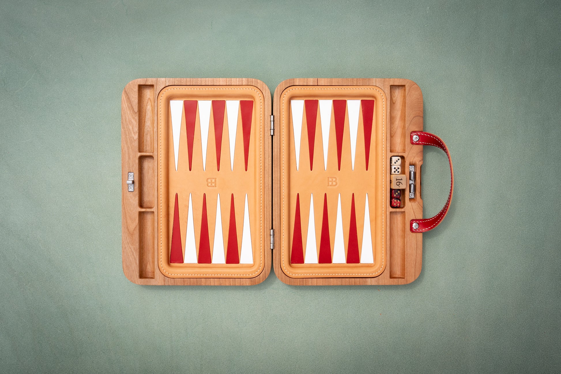 This portable backgammon board is made with Cherry wood, Italian Conceria Walpier leather, stainless steel hardware and Vinymo thread.