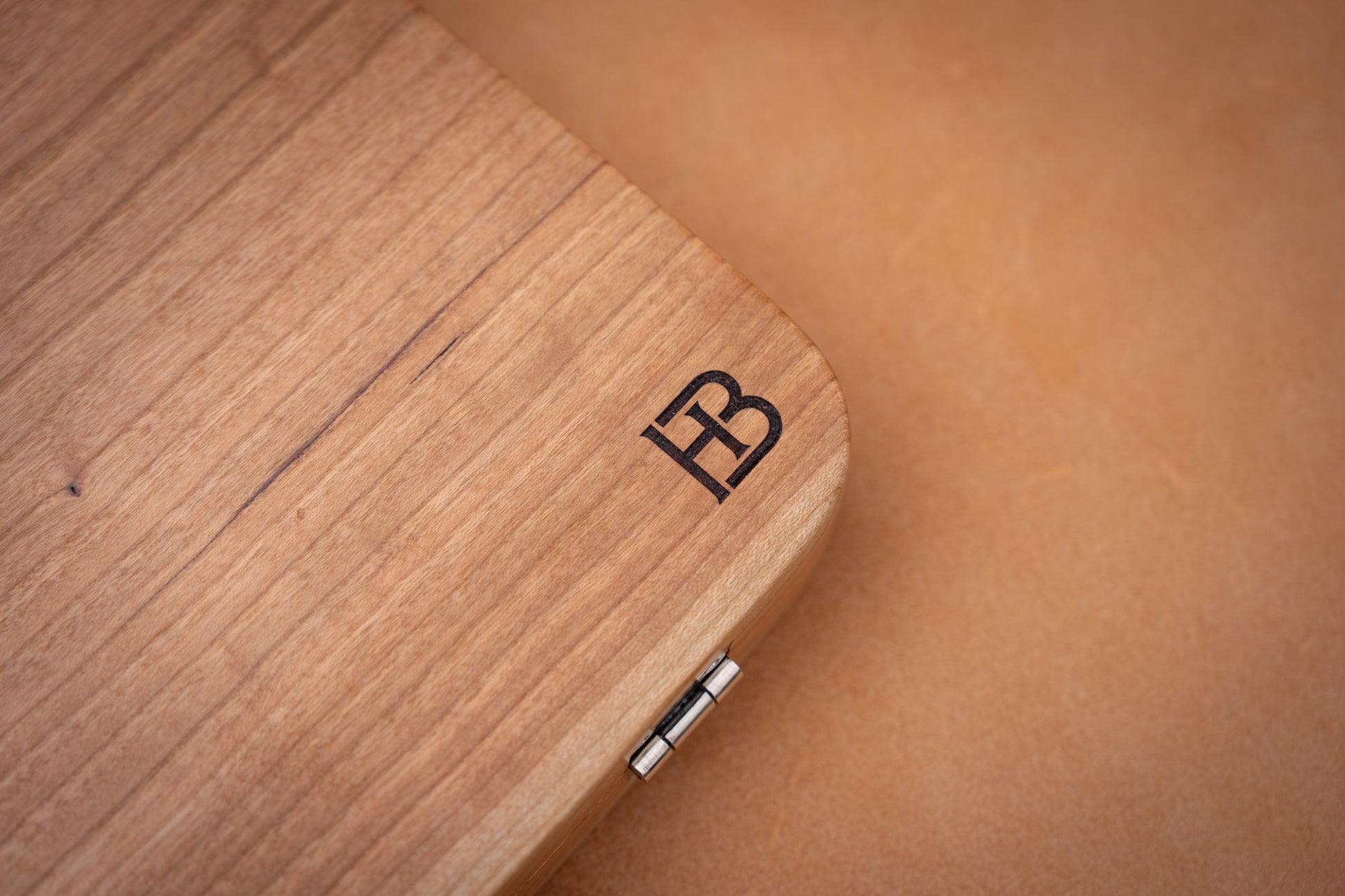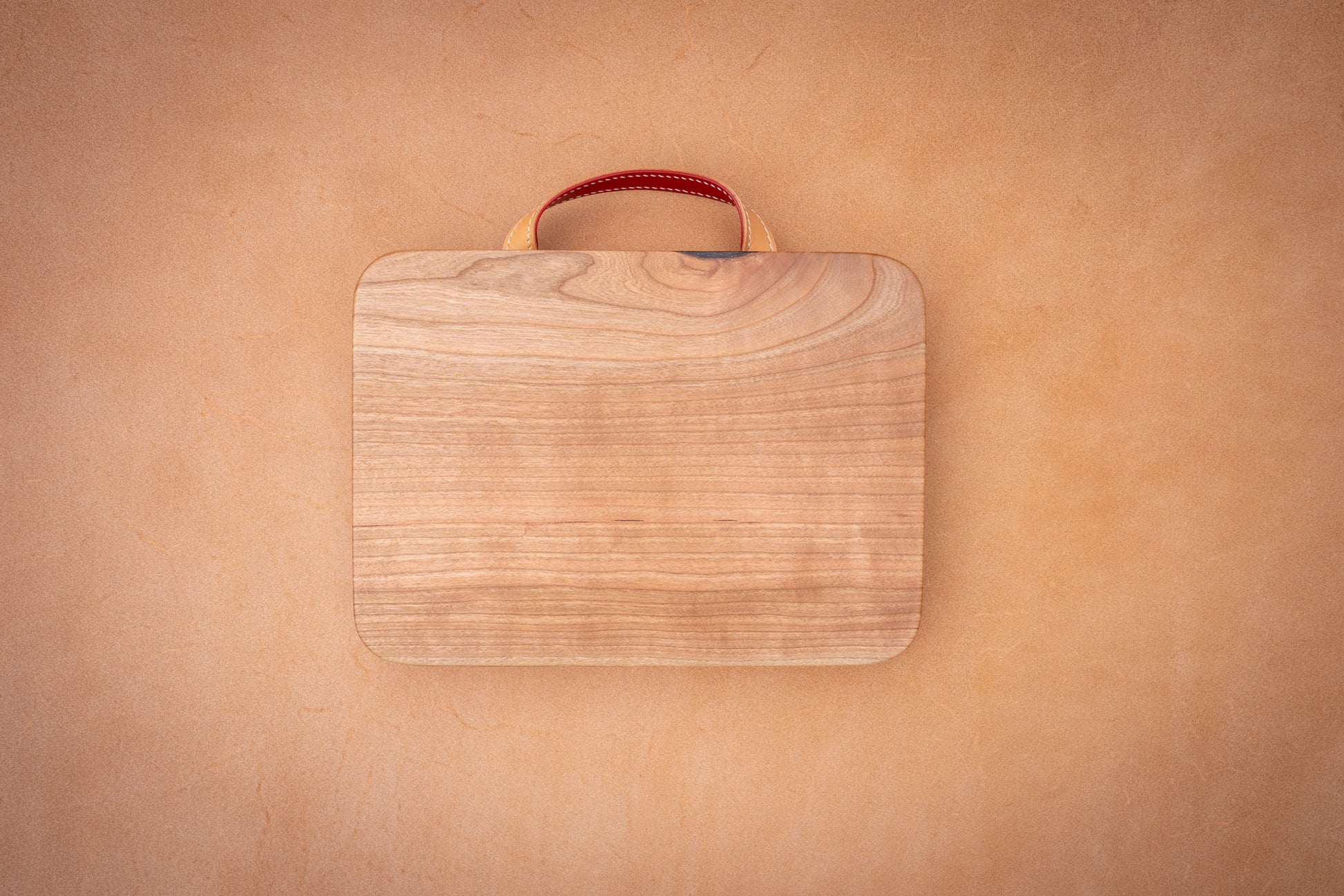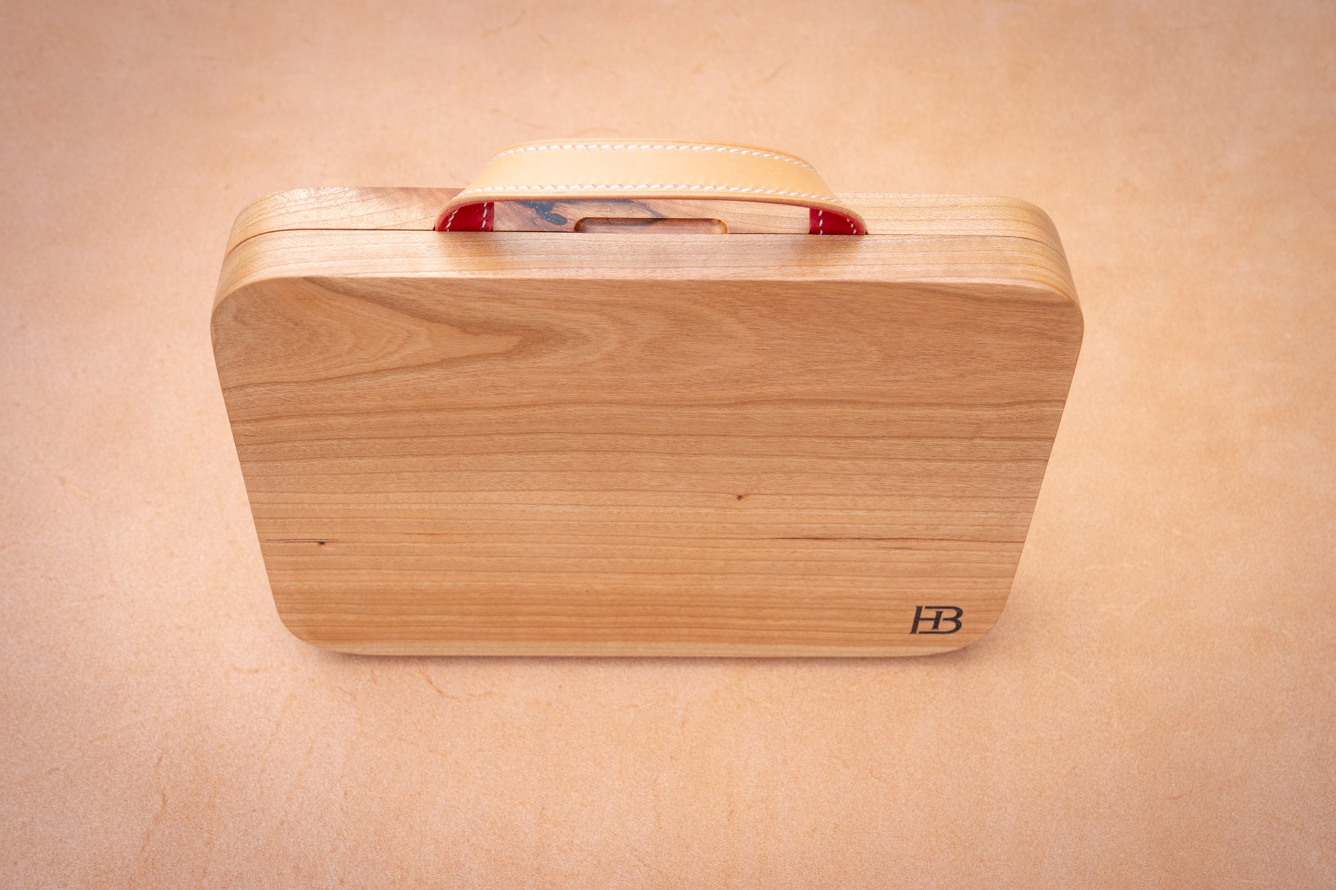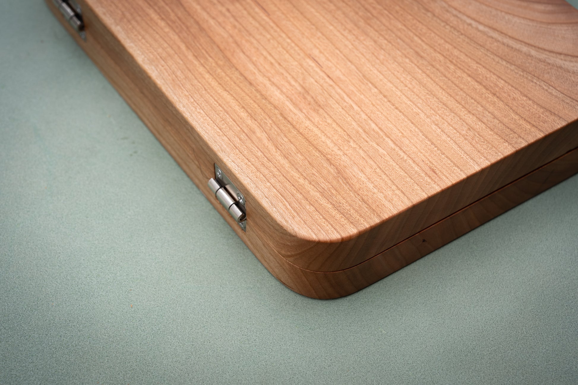 This portable backgammon board is made with Cherry wood, Italian Conceria Walpier leather, stainless steel hardware and Vinymo thread.
